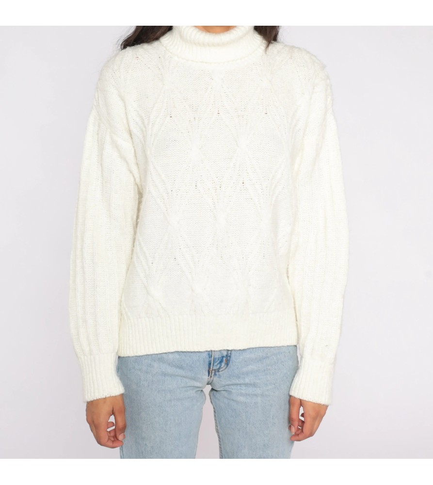 This cream turtleneck sweater is a timeless cold-weather essential with quiet, elevated texture. The front features a refined diamond stitch pattern with delicate open-knit points that add dimension without looking busy. A classic turtleneck collar and clean, minimal silhouette make it easy to style—polished enough for everyday wear, yet cozy enough for layering through fall and winter.