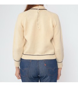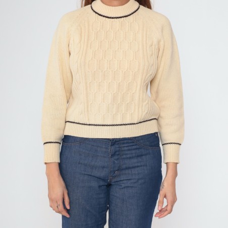This cream knit sweater is a timeless classic with subtle design upgrades. The front features a rich basket-weave style textured panel framed by cable-knit detailing, adding depth and a refined, crafted look. Finished with clean contrast piping at the neckline, hem, and cuffs, it delivers a polished, slightly preppy feel that’s easy to dress up or down for everyday wear.
