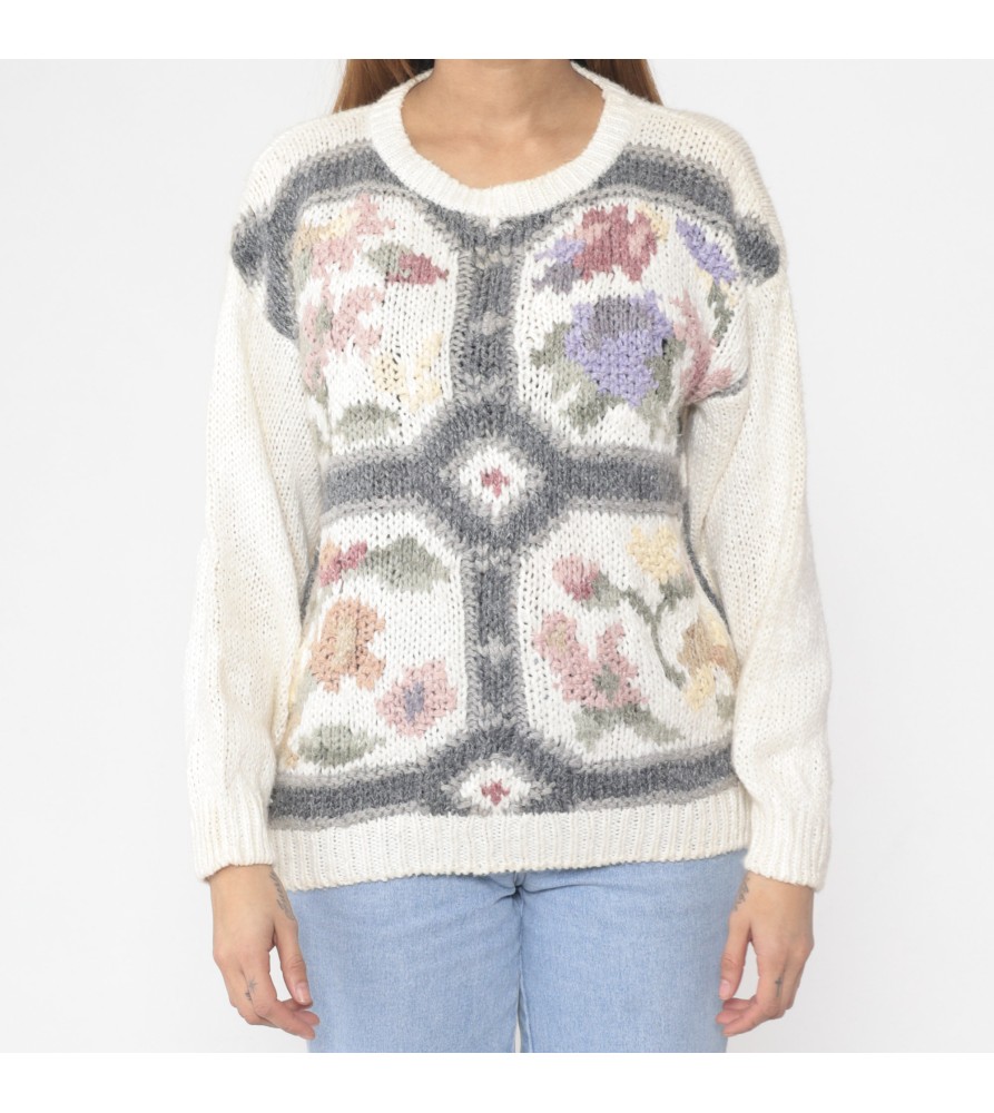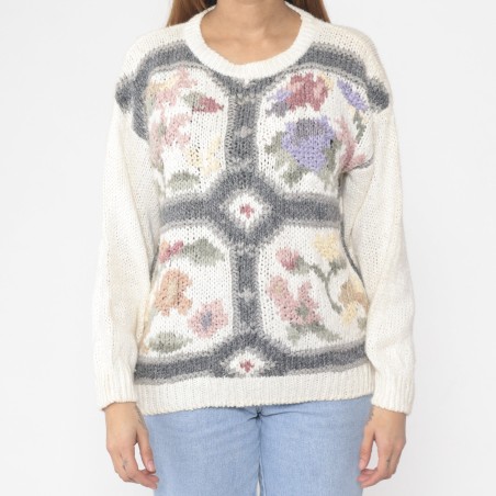 This ivory knit sweater features a romantic, artful design that feels like a wearable vintage tapestry. The front is decorated with soft-focus floral intarsia panels, arranged like framed “window” scenes, and outlined by a grey geometric border for contrast and structure. The result is cozy yet elevated—perfect for adding color and texture to simple denim while keeping the overall palette gentle and easy to style.