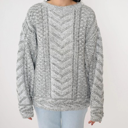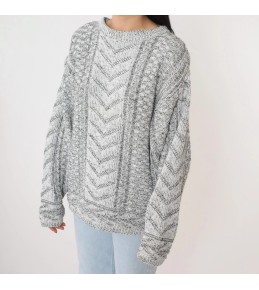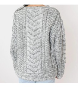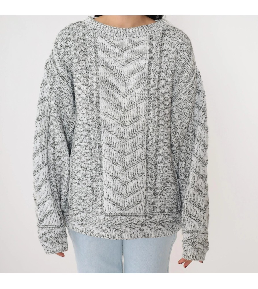 This grey marled sweater is a warm, textured staple with a handcrafted look. The front features a standout chevron cable-knit center panel, framed by chunky textured knit on each side for extra depth and dimension. With a relaxed silhouette, dropped shoulders, and long sleeves, it delivers that cozy, slightly oversized feel—perfect for effortless cold-weather outfits.