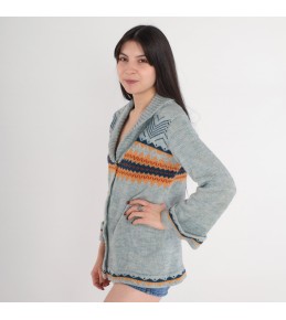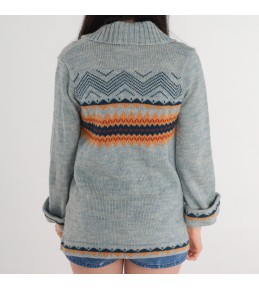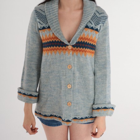 This light blue cardigan blends a cozy heritage pattern with an easy, laid-back silhouette. Designed with a wide shawl collar and a deep V opening, it creates a flattering neckline and an effortless layered look. Across the chest sits a bold Fair Isle–inspired geometric band in warm orange and deep navy tones, adding vintage character and color contrast. Finished with a classic button-front closure and cuff/hem pattern details, it’s a standout knit layer for cooler days.