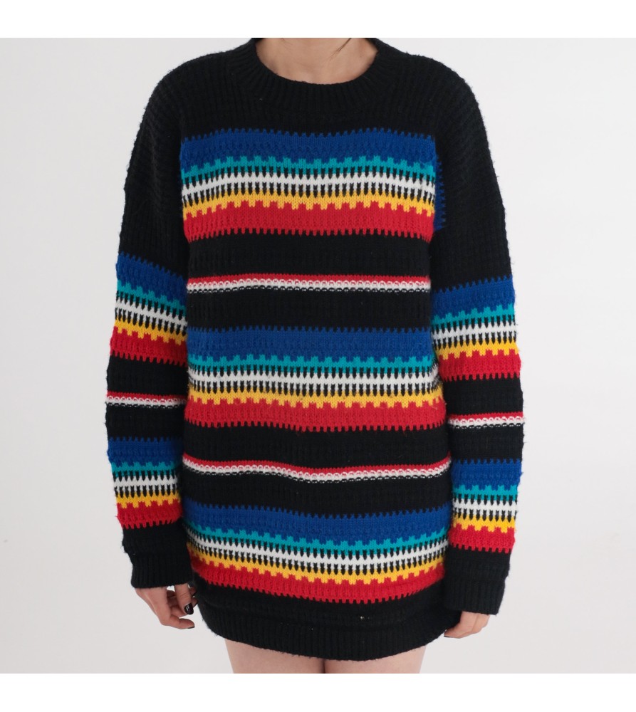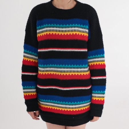 This black knit sweater brings bold color to a classic silhouette with vibrant rainbow striping across the body and sleeves. The multicolor bands are built from a textured, open stitch pattern that adds depth and a handcrafted feel, while the black base keeps the look grounded and easy to style. With a relaxed, slightly longer fit, it’s an effortless statement piece that pairs perfectly with simple denim or solid-color bottoms.