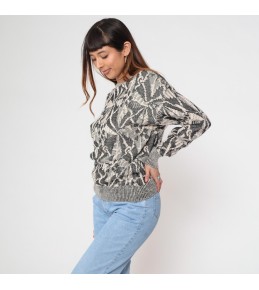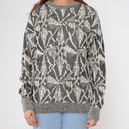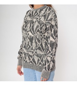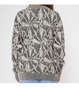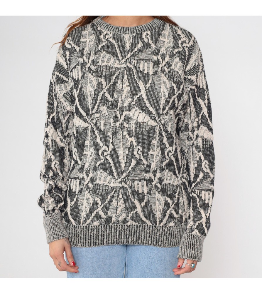 This grey knit sweater features an artistic, all-over jacquard pattern that looks like a hand-drawn abstract print. The tonal mix of charcoal, heather grey, and ivory creates depth while staying neutral and easy to style. With a classic crew neckline, long sleeves, and ribbed trim, it’s a comfortable cold-weather piece that instantly adds texture and visual interest to simple denim or solid-color bottoms.