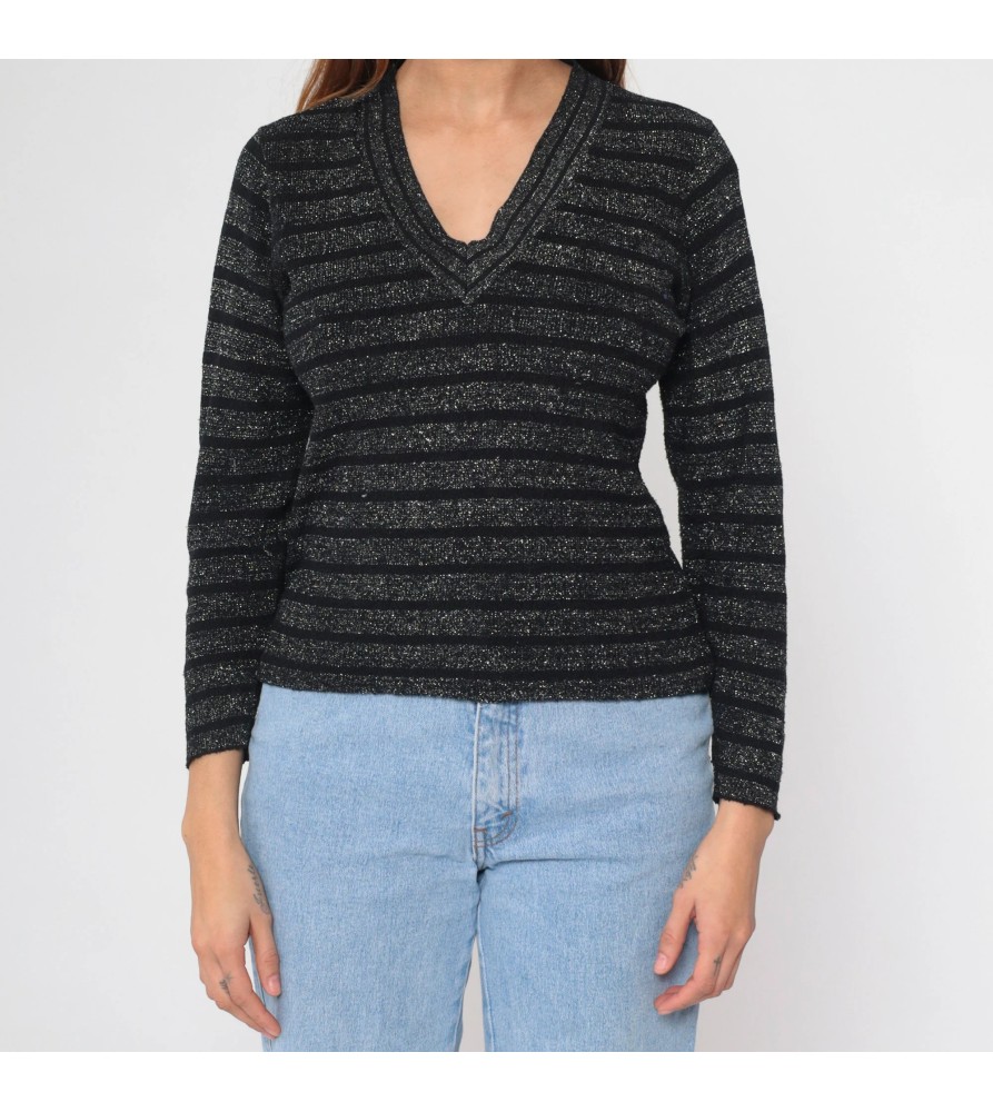 This black knit sweater adds a subtle glow to a classic silhouette with fine metallic shimmer striping throughout. The tonal horizontal bands create depth without looking loud, while the flattering V-neckline keeps the look clean and elongating. With a streamlined fit and lightweight knit feel, it’s an easy piece to wear from day to night—polished enough for dinner plans, simple enough for everyday outfits.