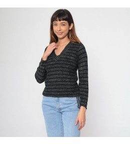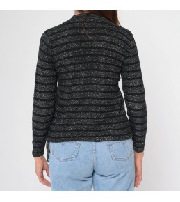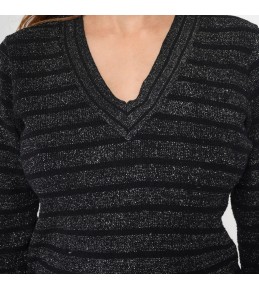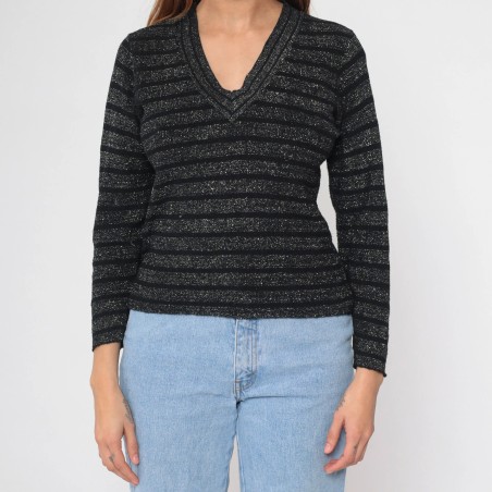 Black Metallic Stripe V-Neck Knit Sweater