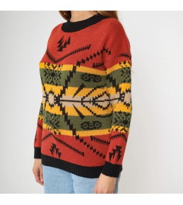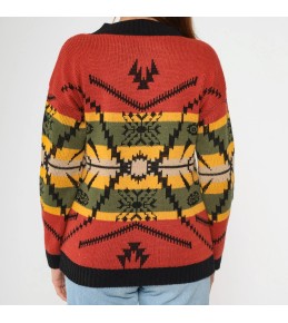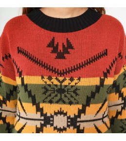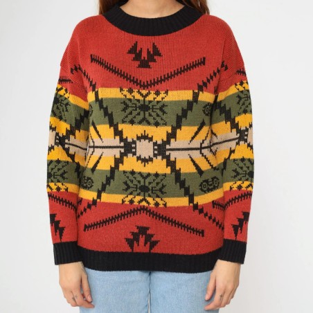 This statement knit sweater blends warm, earthy tones with a striking Western-inspired geometric design. Set on a rich rust red base, the front features layered pattern bands in mustard, olive, cream, and black, including snowflake-style motifs and a bold central graphic that gives a heritage, outdoor-ready feel. Finished with a classic crew neckline and solid ribbed trim at the collar, cuffs, and hem, it’s a cozy cold-weather piece that instantly elevates simple denim.