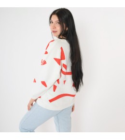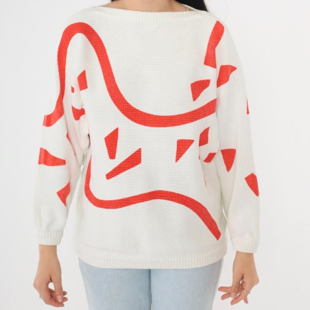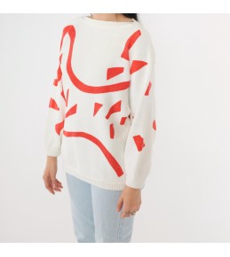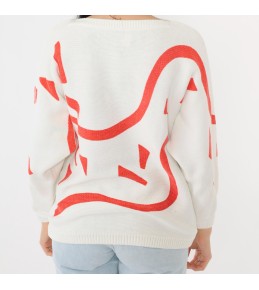 This white knit sweater makes a modern statement with an oversized abstract red graphic that sweeps across the front and sleeves. The clean ivory base keeps it fresh and easy to style, while the bold red curves and geometric accents give it an art-inspired, contemporary feel. Finished with a classic neckline and ribbed trim, it’s the kind of piece that instantly elevates simple denim with minimal effort.