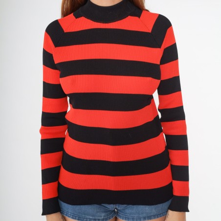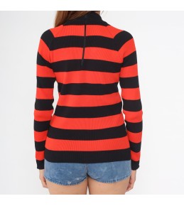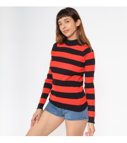 This red-and-black striped sweater delivers a bold, confident look with a clean, streamlined silhouette. The high-contrast horizontal stripes make an instant statement, while the mock neck adds a polished edge that feels slightly retro and effortlessly cool. Crafted in a ribbed knit texture, it hugs comfortably without looking bulky—perfect for styling with denim, skirts, or layering under jackets.